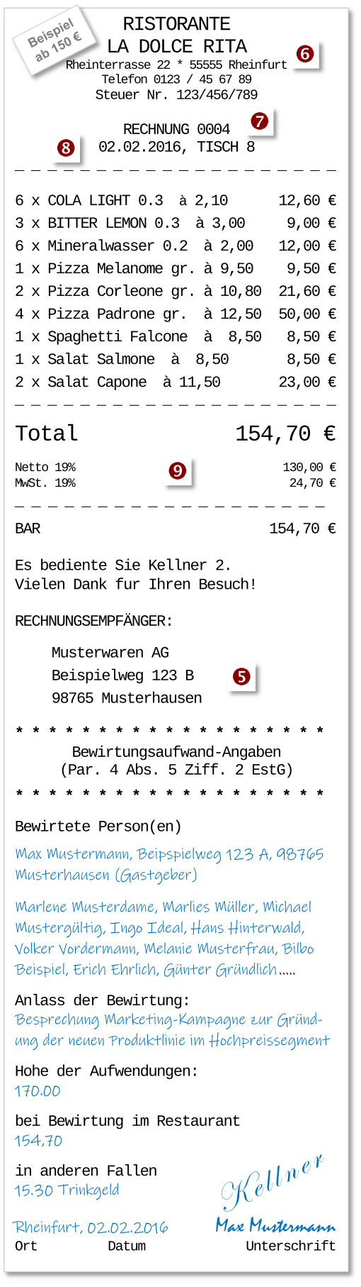 Der leistende Unternehmer (das Restaurant) muss in seiner Rechnung folgende Angaben machen. (Fehlt auch nur eine Angabe auf der Rechnung, verliert der Gastgeber den Anspruch auf Steuerabzug der Bewirtungskosten.)